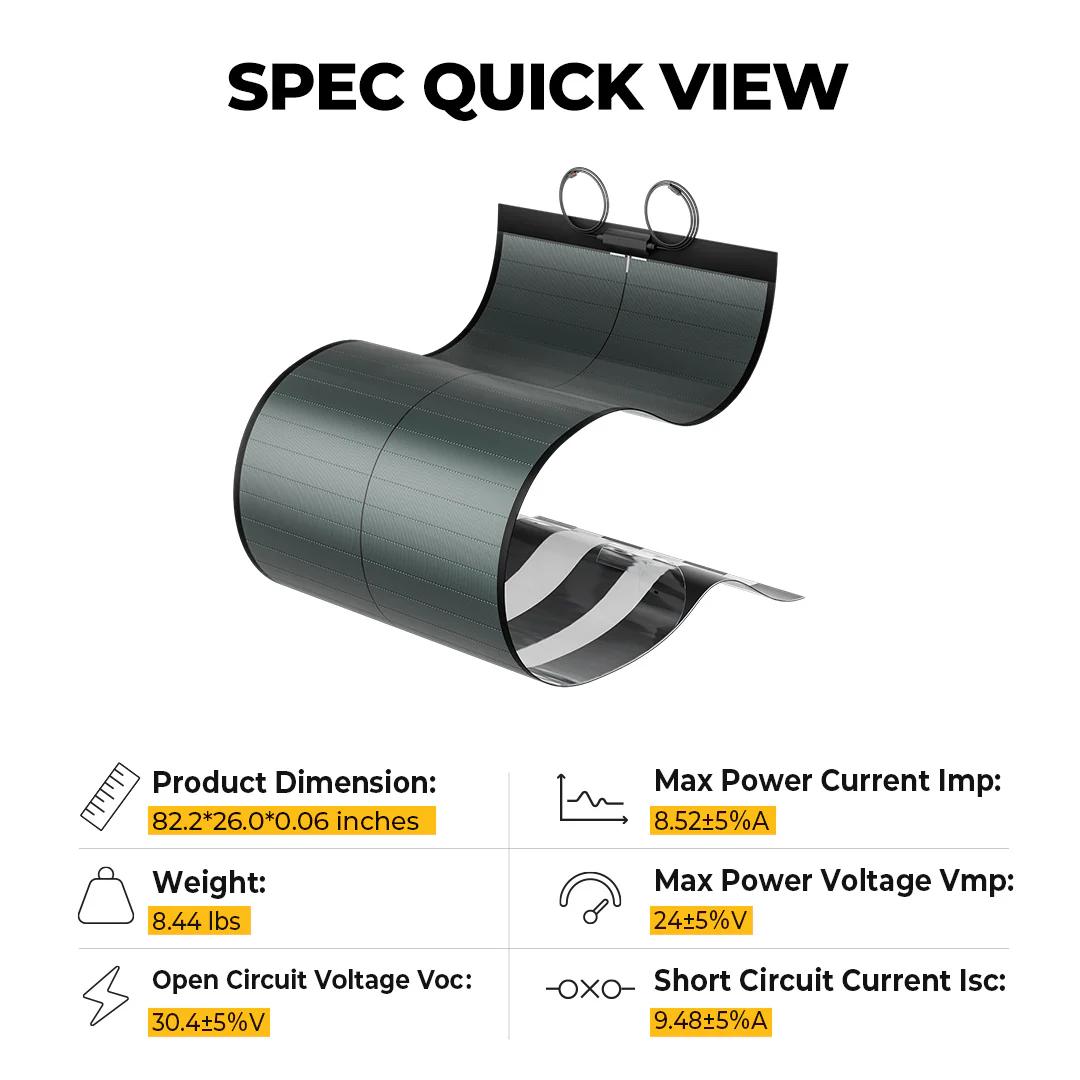 | Short Circuit Current (Isc) | 9.48±5%A | Dimensions | 82.2*26.0*0.06 inches |