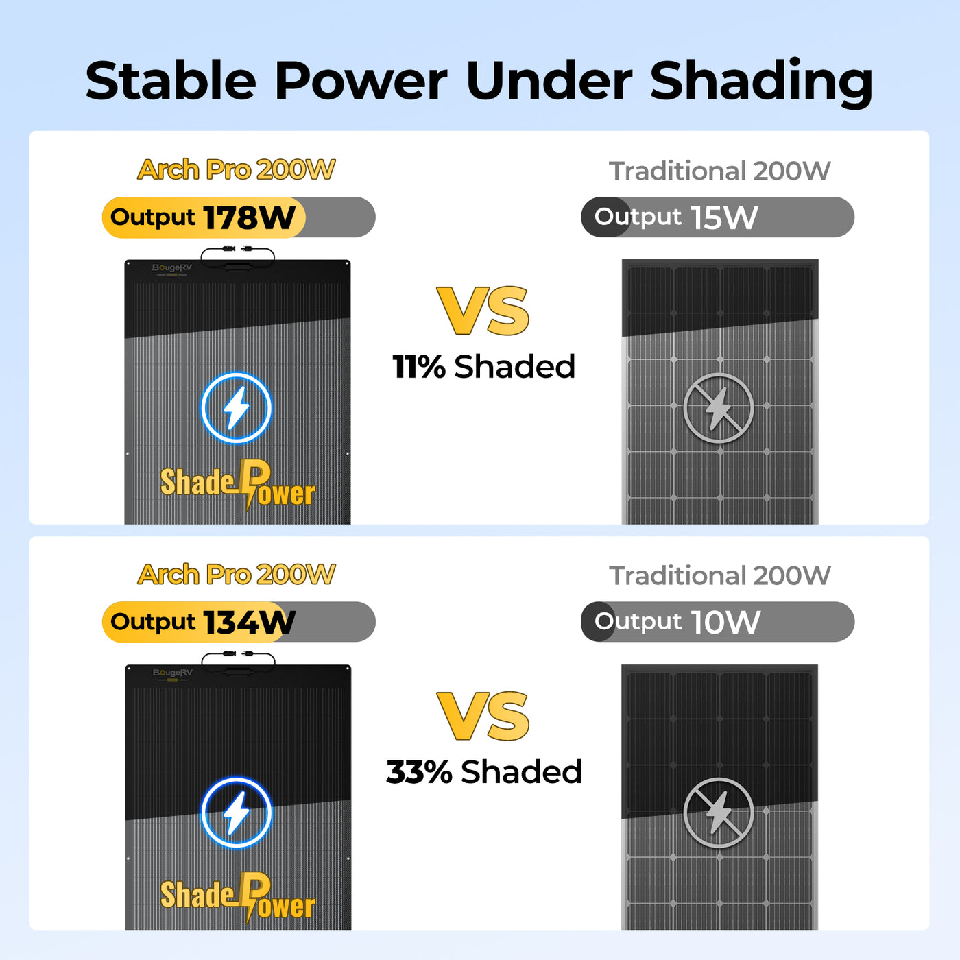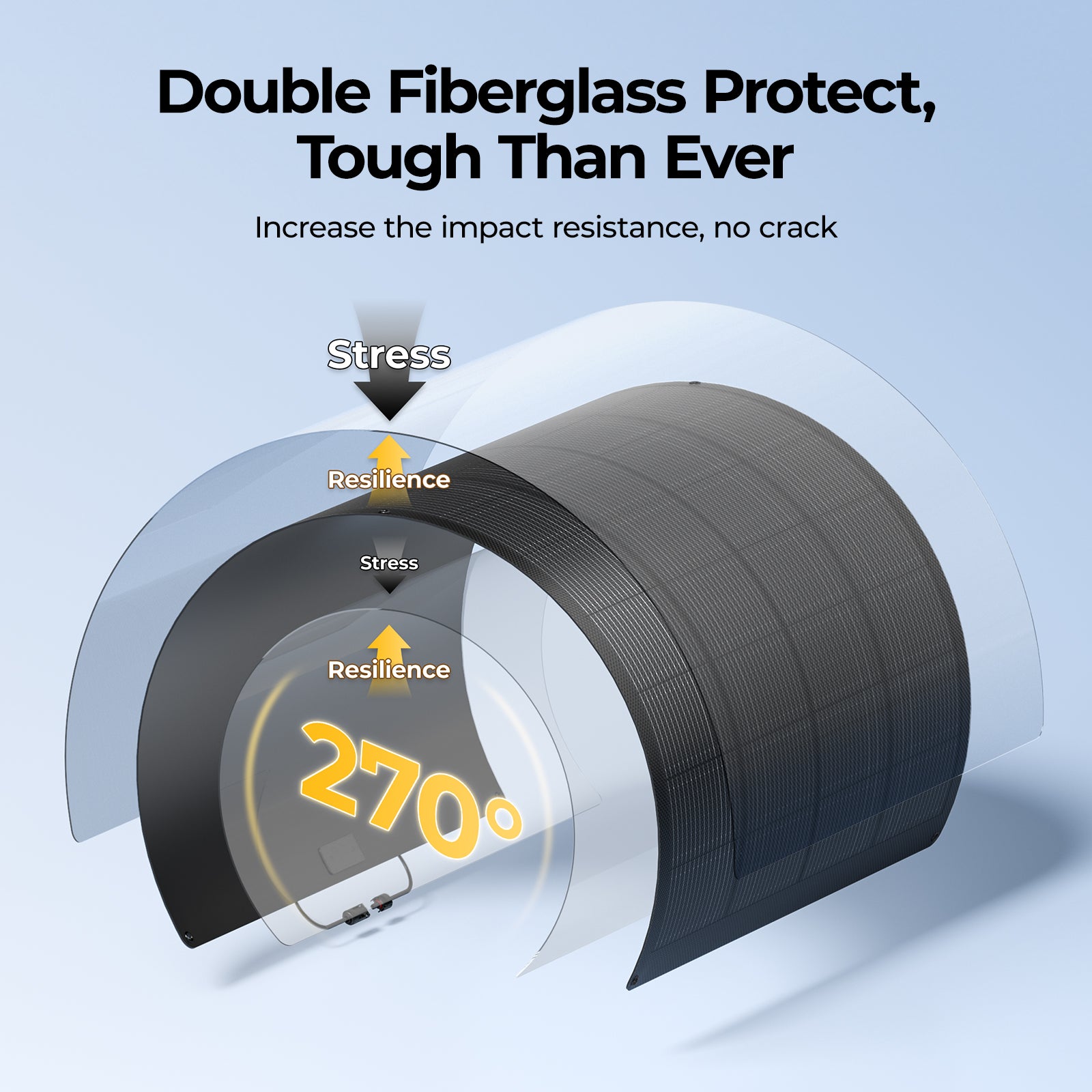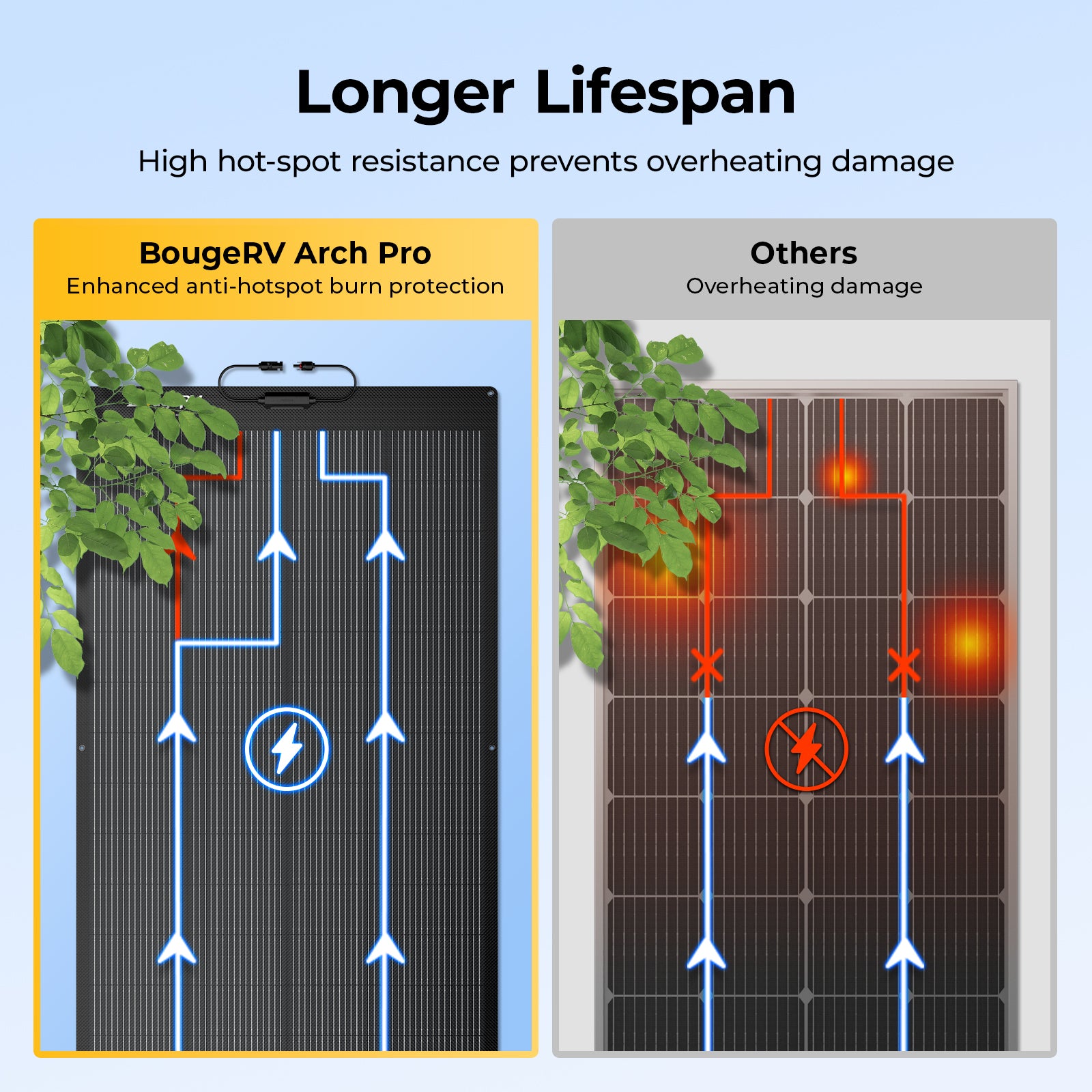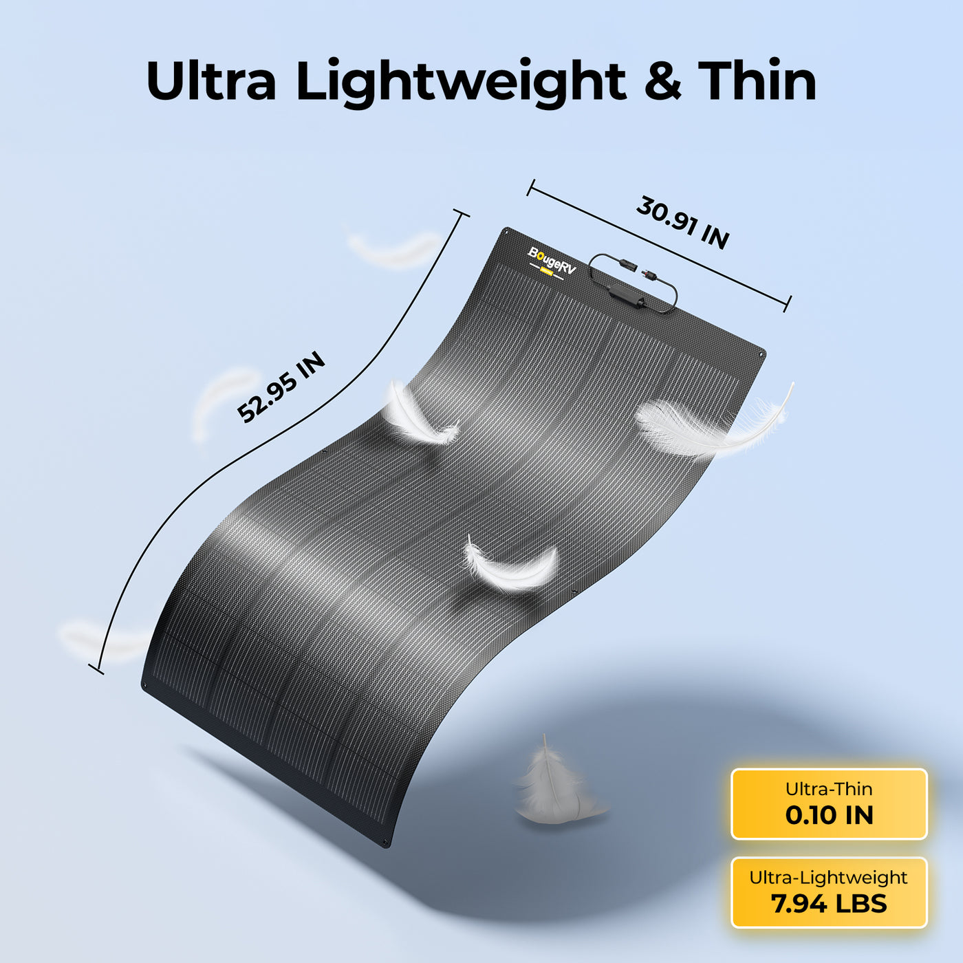 The decision to choose a curved solar panel or traditional solar panel depends on the specific requirements, budget, and personal preferences. The BougeRV 100W flexible solar panel, made of glass fiber, incorporates the advanced 10BB cell design and an extended lifespan for the panel.