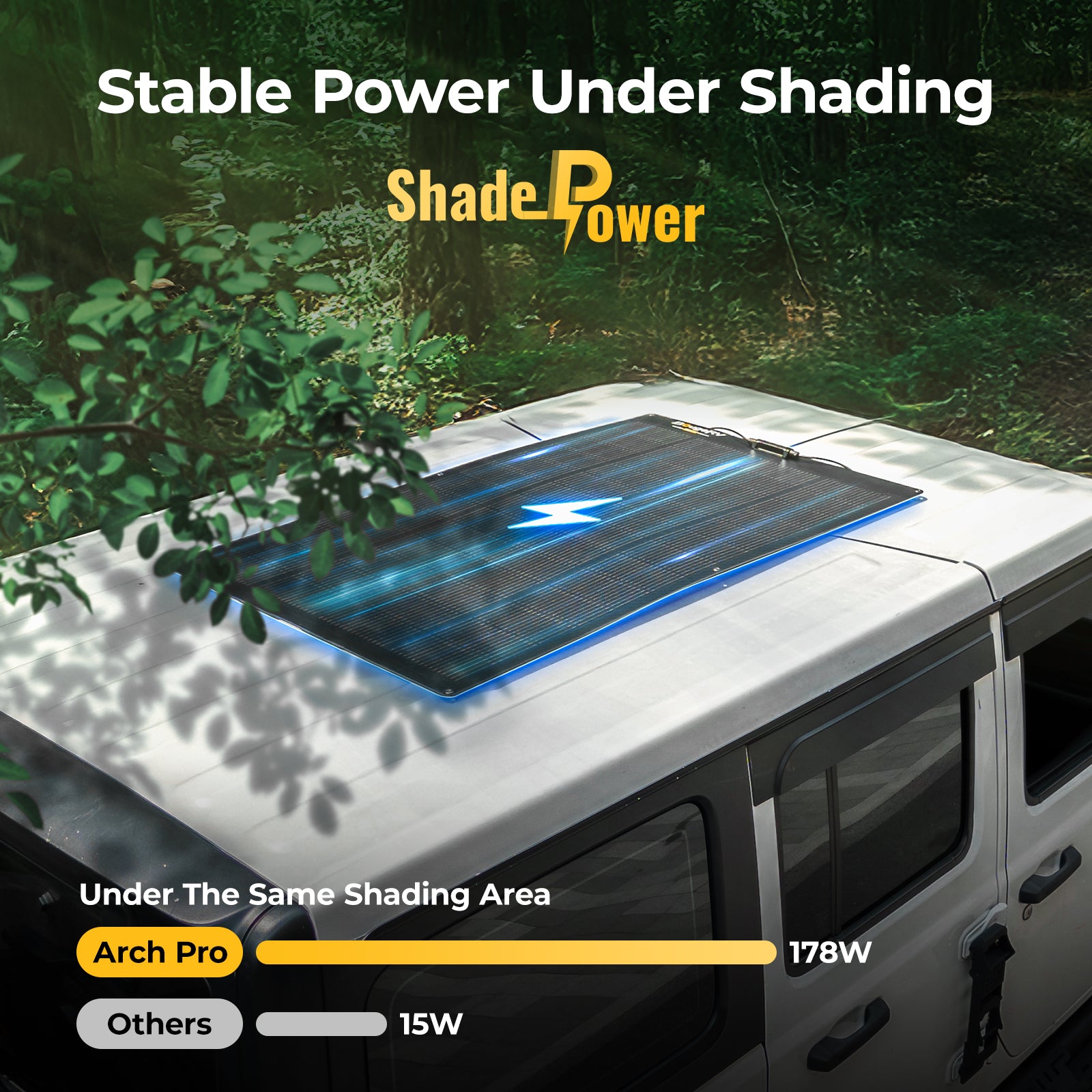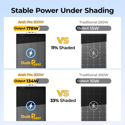 The BougeRV 100W curved solar panel is made with high-quality 10BB cells, resulting in a remarkable 23% conversion rate, the highest in its class. This design feature not only extends the solar panel's lifespan but also enhances its efficiency.