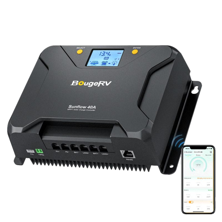 BougeRV Sunflow 40 Amp MPPT controller can adjust the charge current from 0A to 40A. BougeRV charge controller for solar panels, its high tracking efficiency is up to 99.5%, peak conversion efficiency is up to 99%, maximizing the solar panels' output. Adopting quality aluminum heat sink, the battery regulator can dissipate heat better and minimize the power lost under full load working.