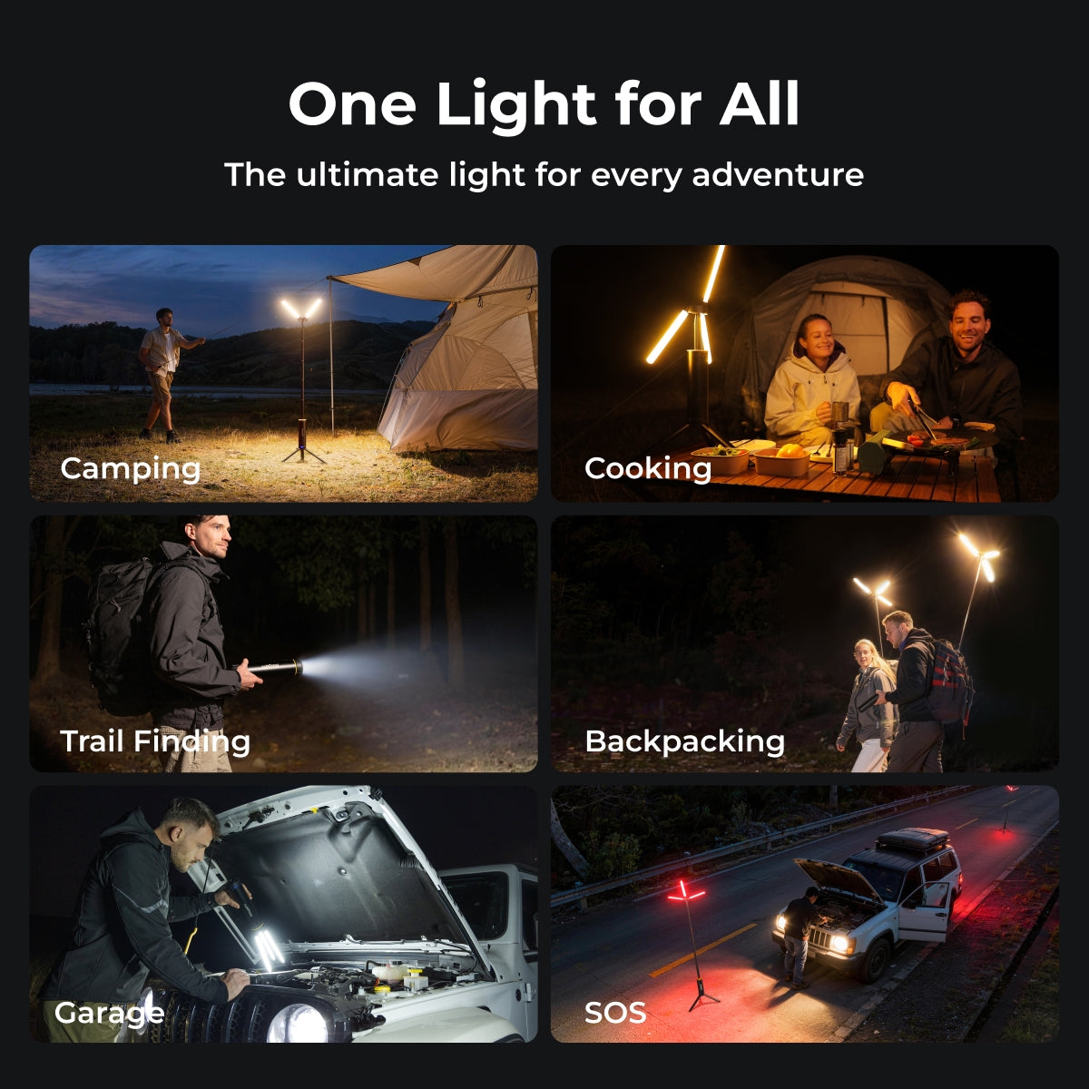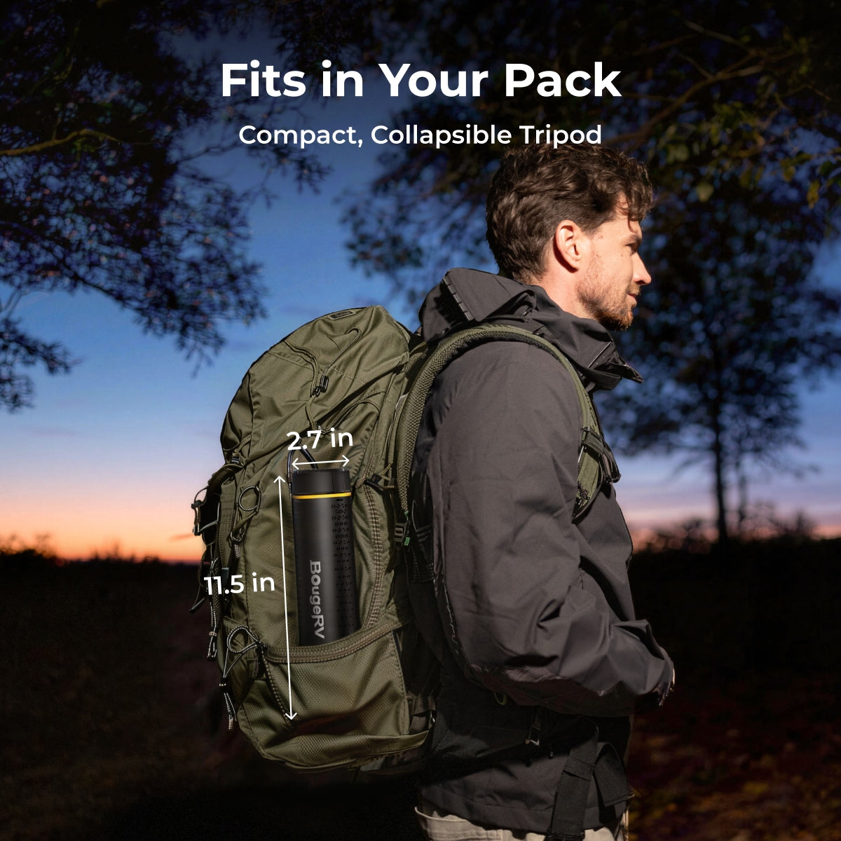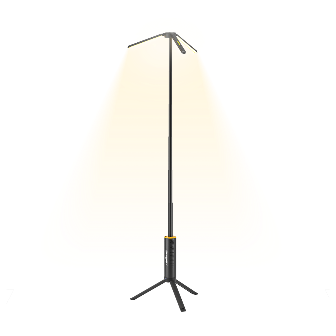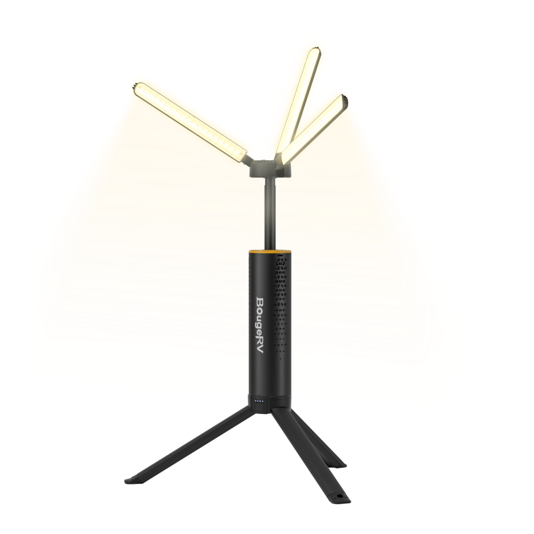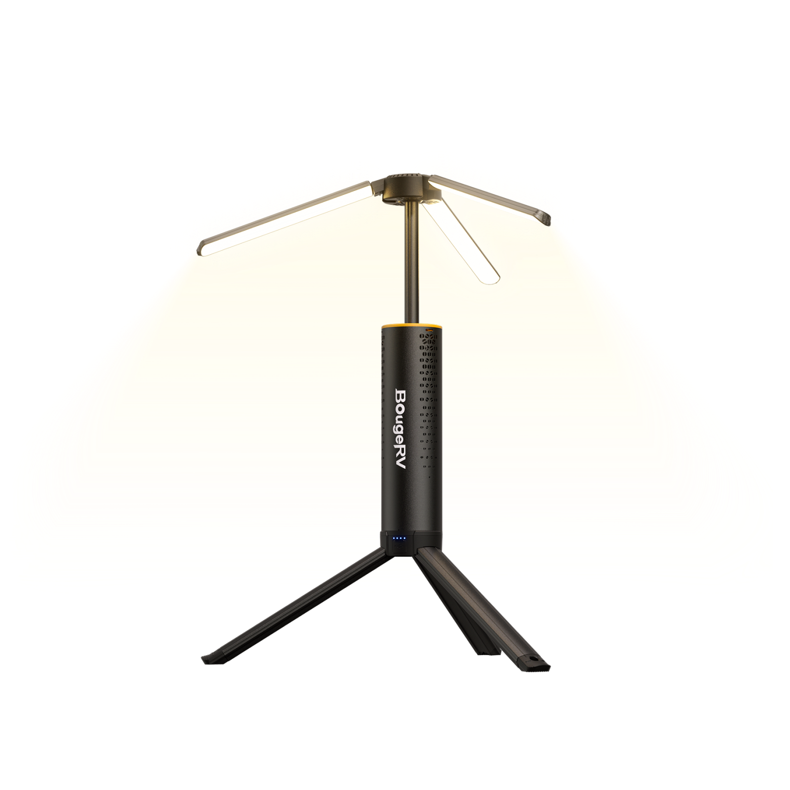 BougeRV T1 Portable Telescopic Camping Lantern is a reliable and atmospheric lighting solution for camping, RV trips, and emergency use. With a telescopic height of up to 5.5 ft, it delivers wide-area illumination covering 1076 ft², ideal for tents, campsites, and outdoor gatherings. A 15600mAh high-capacity battery delivers up to 90 hours of runtime, while 3-hour fast charging keeps downtime to a minimum. Featuring three brightness levels and a multi-functional design, this long-lasting camping light easily transforms into a table lamp, floor lamp, hanging lantern, flashlight, or SOS light.